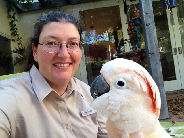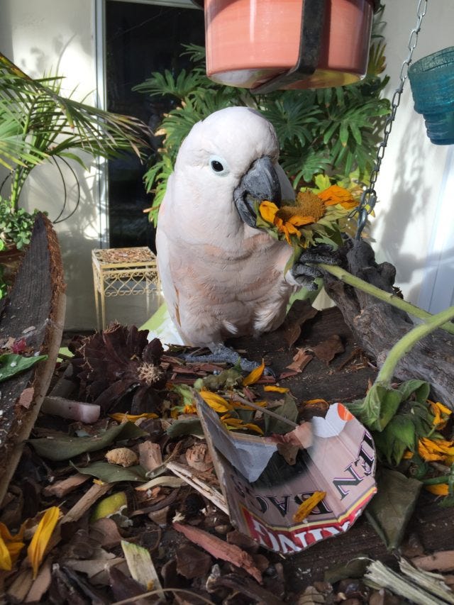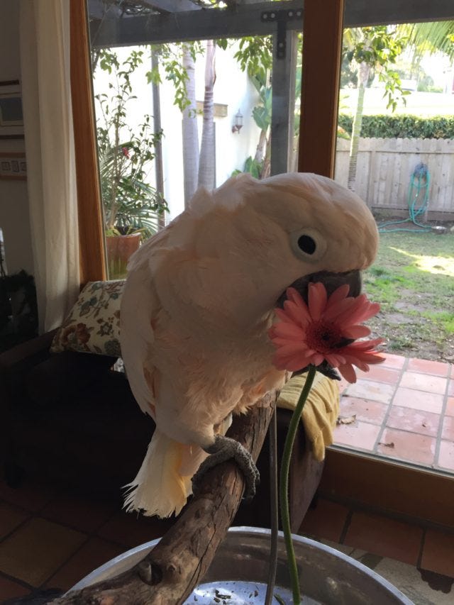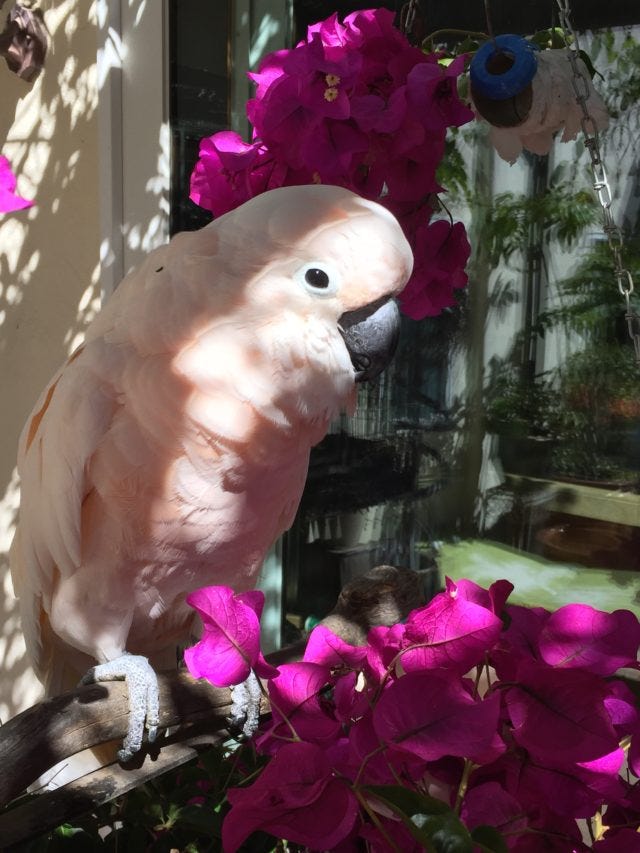 This is Jeremy, an exotic parrot. I adopted him 31 35 years ago. He is a Moluccan, or Salmon-Crested Cockatoo, and he will be 32 36 years old in June.