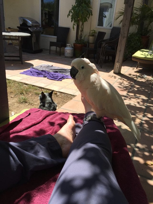 He’s a living, breathing, nesting, molting, preening, pruning, cuddling, sounding-off, reflection of me. And if what he says is true, I’m suddenly, (quite unexpectedly) aware that I am an engaging, caring, loving, person, giving and receiving attention as best I can in this often confusing world.